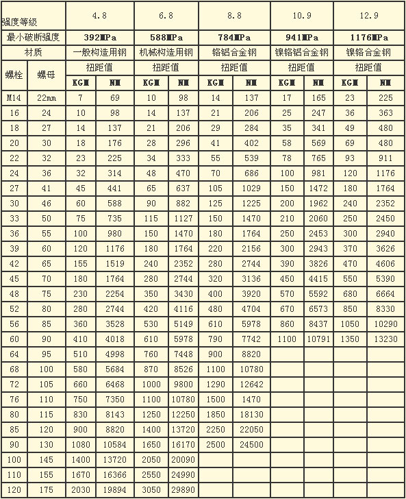 1、以上是德國工業(yè)標準,表中扭矩值為螺栓達到屈服極限的70%時所測定。